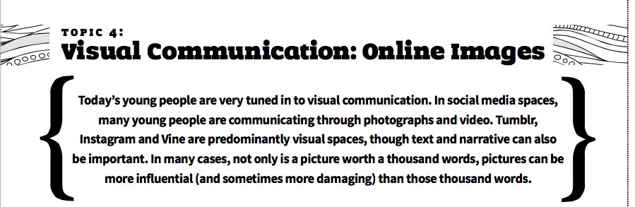 While the book is primarily for grades four and up, I believe there’s a good argument for teachers simplifying some of these activities for third graders — even kids that age know a lot about what’s going on in the digital world. Some activities, in fact, such as image evaluation should be modified to begin as soon as children start examining images (Kindergarten, perhaps? Read my 2010 post on evaluating images in picture books.) A child emerging from early grades with a deep understanding of the images in daily life has a huge head start with digital citizenship.