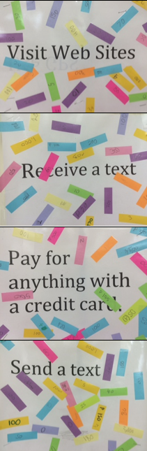 Early in the school year fifth graders and their parents kept a short diary, estimating the footprints in a range of categories and then returned to school with the results. Footprints were estimated for sending texts, banking, receiving texts, purchasing groceries, cell phone calls, online banking, web sites, online purchases, and about a dozen more categories.